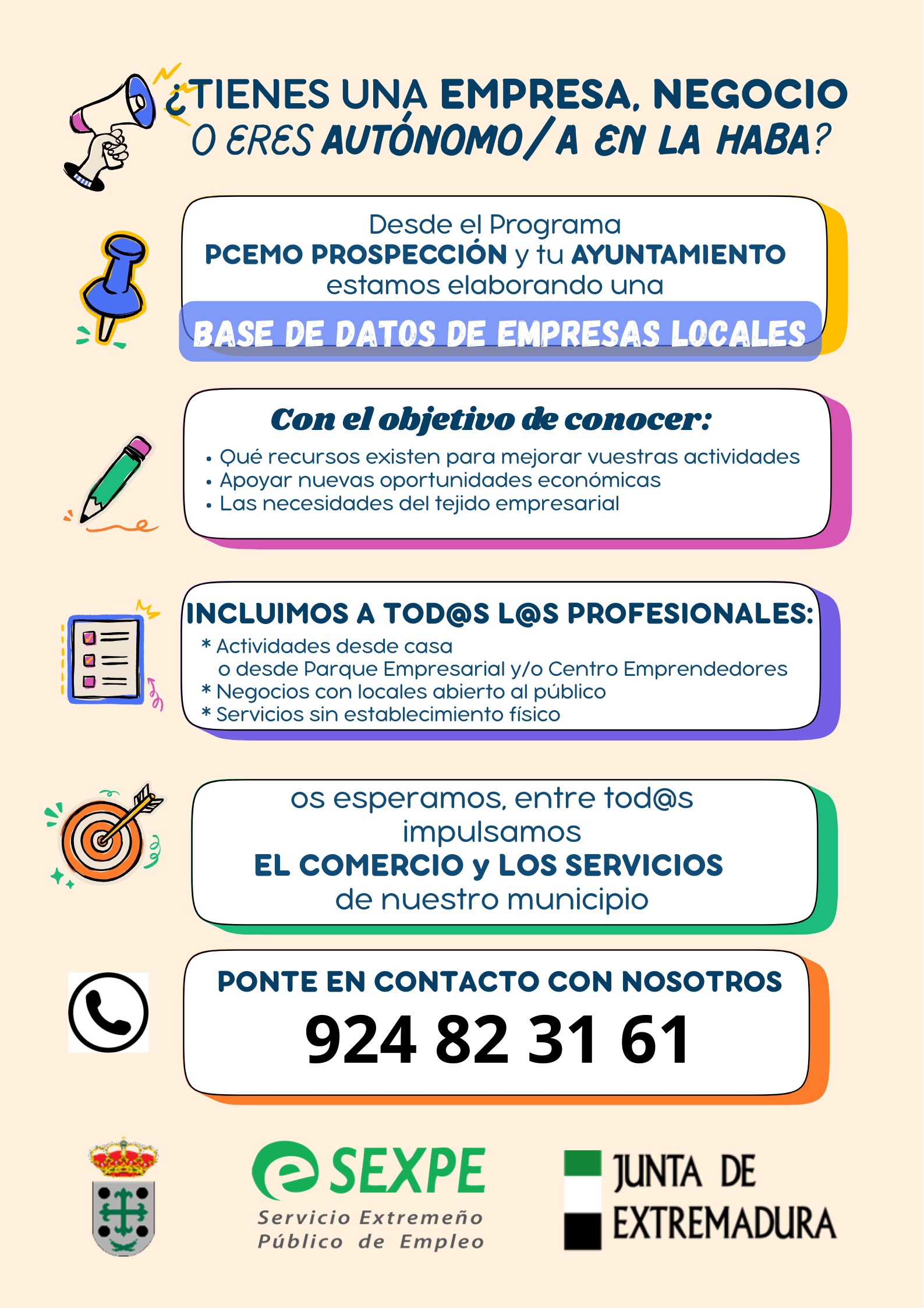 Desde el Programa de Colaboración Económica Municipal de Orientación y Prospección para el Desarrollo Local (PCEMO LA HABA) estamos elaborando y actualizando la BASE DE DATOS DE LAS EMPRESA LOCALES, desde el Ayuntamiento seguiremos apostando por el comercio y los servicios de nuestro municipio.