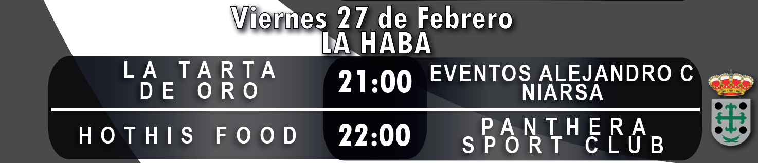El viernes 27 de Febrero se jugará el partido correspondiente a la décimo tercera jornada de la segunda vuelta de la liga comarcal de fútbol sala en el Pabellón Municipal a las 21:00 h .Donde se enfrentaran La Tarta de Oro VS Eventos Alejandro C Niarsa y Hothis Food VS Panthera Sport Club